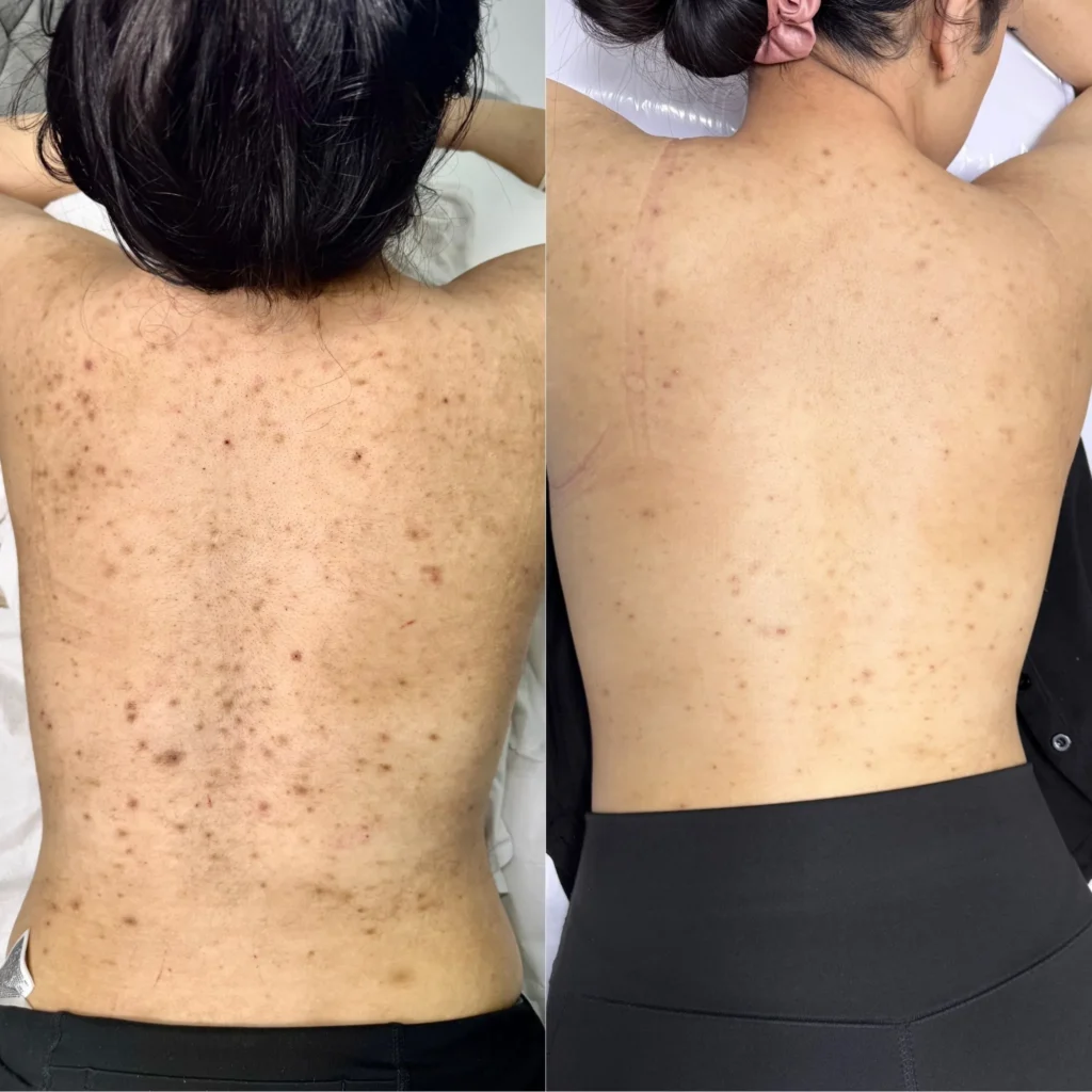 These peels effectively treat uneven skin tone, pigmentation, dark spots, acne scars, and rough skin on targeted body areas.